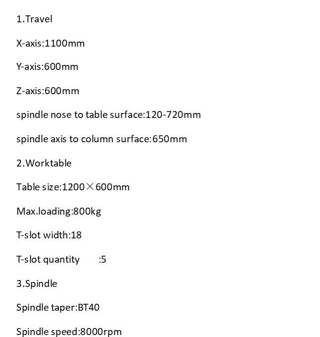 CENTRO DE MECANIZADO VERTICAL MARCA TOS TIMEMASTER, MODELO VMC1160 , MESA DE TRABAJO DE 1200 X 600 mm, RECORRIDOS DE LOS EJES: X= 1.100mm, Y=600mm, Z=600mm, DISTANCIAS DEL HUSILLO A LA BASE DE LA MESA DESDE 120 A 720 mm, EJE DEL HUSILLO A LA SUPERFICIE DE LA COLUMNA DE 650mm, MAXIMO SOPORTE SOBRE LA MESA DE 800 KG, HUSILLO TIPO BT40-150 , MAXIMA REVOLUCION DEL HUSILLO DE 8.000 RPM, POTENCIA DEL HUSILLO DE 11KW, CONTROL CNC MARCA GSK25I (IGUAL A FANUC CHINO), DEMAS ESPECIFICACIONES LEER CATALOGO ADJUNTO A LAS FOTOS,PESO DEL CENTRO DE 5.500 KILOS Y DIMENSIONES DE 4270 X 2180 X 2500 mm, NUEVO SIN USO.