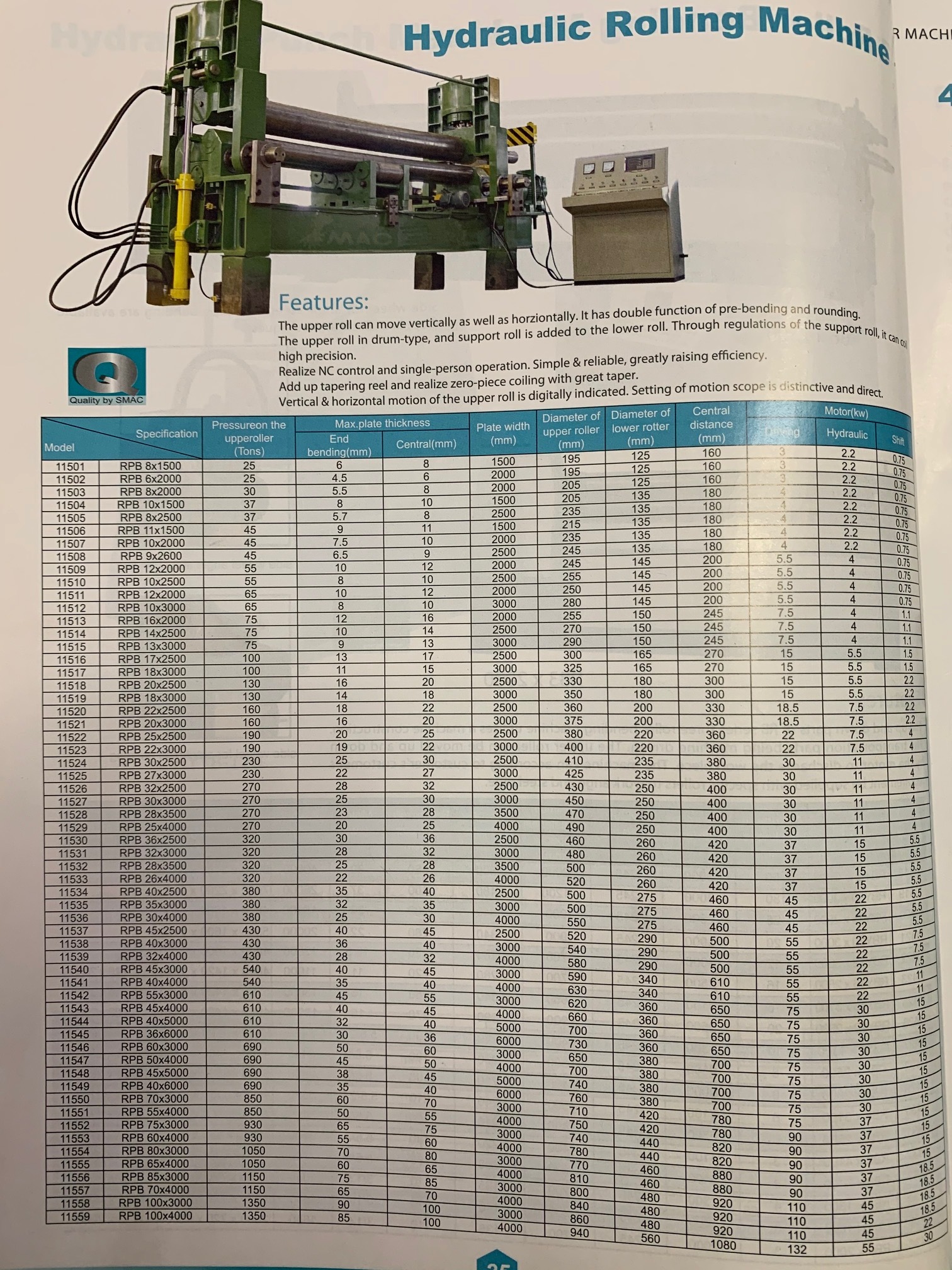 Cilindradora hidráulica con precilindrado, Marca TOS TIMEMASTER , Modelo W11S-20×2500, con precilindrado , control PLC , fabricadas con normas para la comunidad Europea ( normas CE standard), full cubierta protectora .capacidad de cilindrado de 20mm y con función de precilindrado a los 16 mm, largo útil de 2500mm. Presión 130 toneladas, motor principal de 15,0 Kw, motor hidráulico de 5,5Kw. , no incluye accesorio para hacer cilindrado de conos ,Nueva.Catalogo en fotos para ver caracteristicas extras.