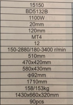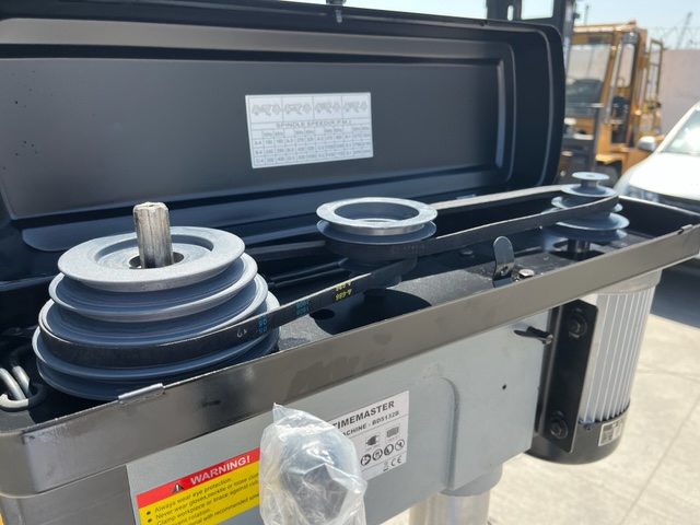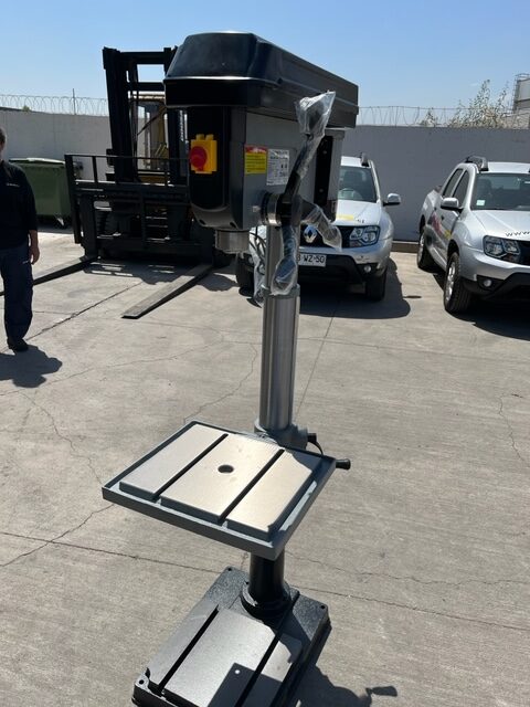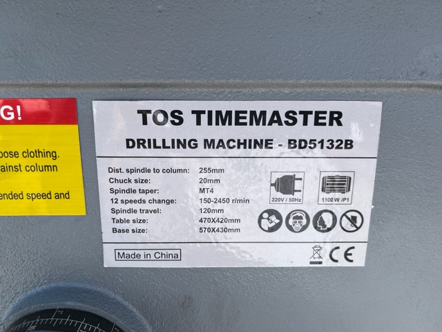 TALADRO DE PEDESTAL, MARCA TOS TIMEMASTER, MODELO BD5132B, RECORRIDO DEL HUSILLO DE 120 MM , 12 VELOCIDADES (150 S 2450RPM) , CAJA DE VELOCIDADES POR CORREAS , MESA DE TRABAJO GIRATORIA A 45 GRADOS , DE 470 X 420 MM , BASE DE 580 X 430MM, RECORRIDO DEL HUSILLO DE 120MM, CONO MORSE NRO.3, DIAMETRO DE LA COLUMNA 92 MM , ALTURA TOTAL DE 1.720 MM, PESO DEL EQUIPO DE 120 KILOS, DIMENSIONES DE 1.731 X 500 X 860MM, PORTA BROCA DE 20MM, POTENCIA DEL MOTOR DE 1100 W, NUEVA SIN USO, FABRICACO BAJO NORMA CE.