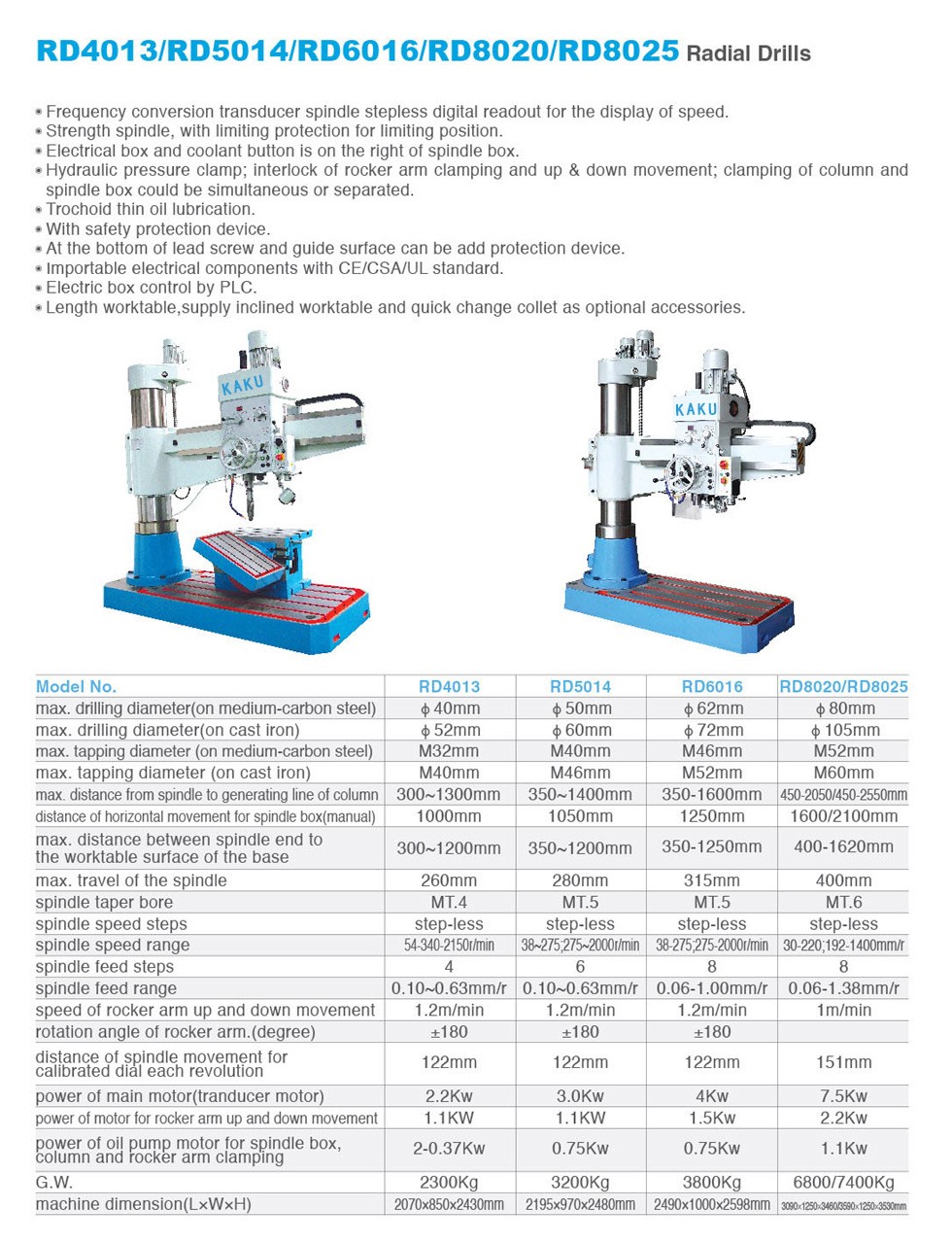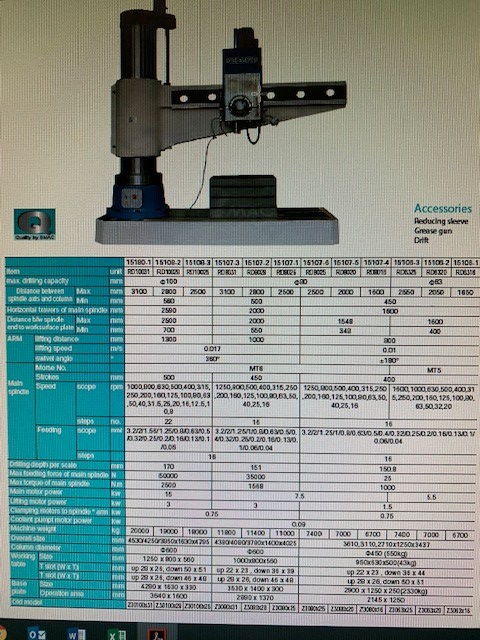 TALADRO RADIAL MARCA TOS TIMEMASTER MODELO RD8025 ,CON CLAMPING HIDRAULICO , CAPACIDAD DE PERFORADO DE 80 MM DISTANCIA MINIMA Y MAXIMA DE DISTACIA A LA COLUMNA DE 500 – 2500 mm ,DIAMETRO DE LA COLUMNA DE 600 mm, DESPLAZAMIENTO MAXIMO HORIZONTAL DE 2.000 MM , ALTURA MAXIMA DE LEVANTE DEL HUSILLO DE 1000 mm , COLUMNA CON GIRO A 360 GRADOS , CONO MORZE DE MT6, 16 VELOCIDADES DEL HUSILLO DE 16 A 1250 rpm ,16 AVANCES DEL HUSILLO , MOTOR PRINCIPAL DE 7,5 KW , MOTOR DE LEVANTE DEL BRAZO DE 3 KW ,PESO DE LA MAQUINA 8.500 KILOS