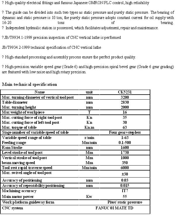 TORNO VERTICAL DE DOBLE COLUMNA MARCA TOS TIMEMASTER MODELO CK5231 DE CONTROL NUMERICO (FANUC OI MATE TD ), DE 3200 mm DE VOLTEO ,PLATO DE 4 GARRAS DE 2.830 mm,ALTURA MAXIMA DE MECANIZADO DE 2.000 mm, MAXIMO PESO DE LA PIEZA A MECANIZAR 15 TONELADAS, VELOCIDADES DEL PLATO DE 1 A 63 RPM,MOTOR PRINCIPAL DE 55 KW,PESO DEL TORNO 48 TONELADAS.