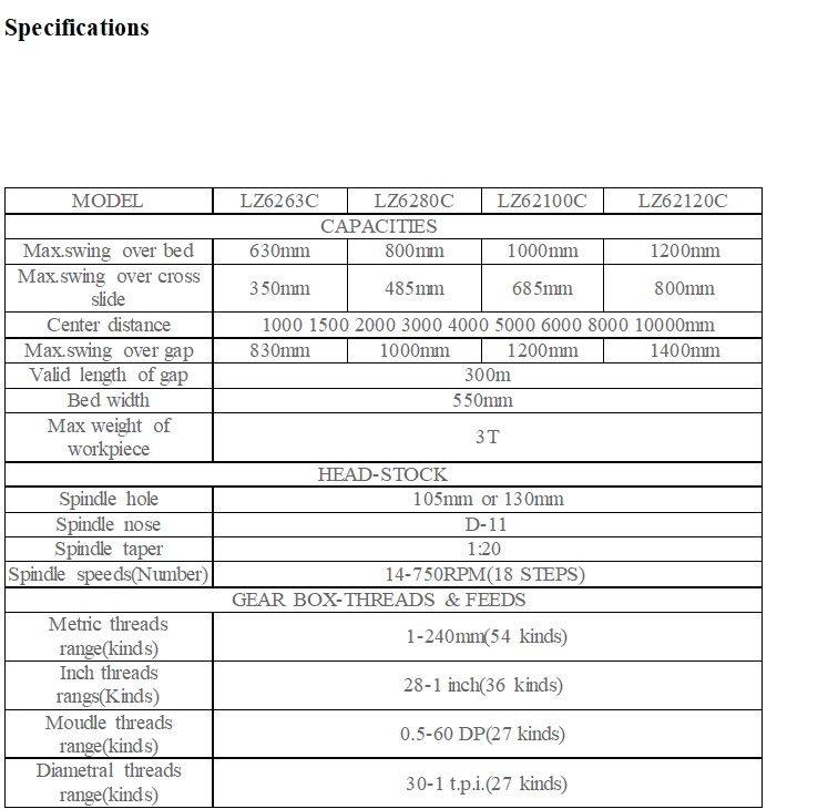 TORNO TOS TIMEMASTER MODELO CW6280E/6000 ( EX LZ6280C/6000)800 MM VOLTEO SOBRE LA BANCADA,1000 MM VOLTEO SOBRE EL ESCOTE, 6000 MM ENTRE CENTRO, PLATO DE 3 DE 500 mm Y 4 GARRAS DE 630 mm, PLATO LISO DE 800 mm , LUNETA MOVIL DE 20-180 mm y FIJA DE 100 A 300 mm ,CARRO MOTORIZADO, PASADA DE HUSILLO DE 105MM, FRENO DE PEDAL, LAMPARA DE TRABAJO, BOMBA DE REFRIGERACI0N ,CONTRAPUNTA, PORTA HERRAMIENTAS CUADRADO CONVENCIONAL, FARO PARA HILOS , BANCADA CON TRATAMIENTOS TERMICOS, RESGUARDO CONTRA VIRUTA, MOTOR DE 15 HP DE 18 VELOCIDADES DE 14 A 750 RPM, HACE GRAN VARIEDAD DE TIPOS DE HILOS EN 4 TIPOS DIFERENTES DE HILOS, PESO DE LA MAQUINA 7200 KILOS, NUEVO SIN USO.