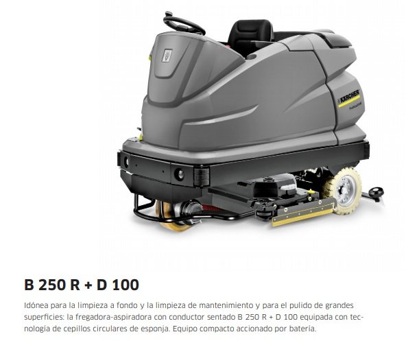 VACUOLAVADORA Y BARREDORA MARCA KARCHER MODELO B250-R, IDÓNEA PARA LA LIMPIEZA A FONDO Y LA LIMPIEZA DE MANTENIMIENTO Y PULIDO DE GRANDES SUPERFICIES: LA FREGADORA-ASPIRADORA CON CNDUCTOR SENTADO B250R + D 100 , NUMERO DE SERIE 10103B, EQUIPADA CON TECNOLOGIA DE CEPILLOS CIRCULARES DE ESPONJA, EQUIPO CON HOMBRE A BORDO Y COMPACTO ACCIONADO A BATERIA, INCLUYE CARGADOR DE BATERIA, EL EQUIPO ES USADO EN PERFECTO ESTADO, DEL AÑO 2014 Y TIENE SOLO 989 HORAS DE USO.